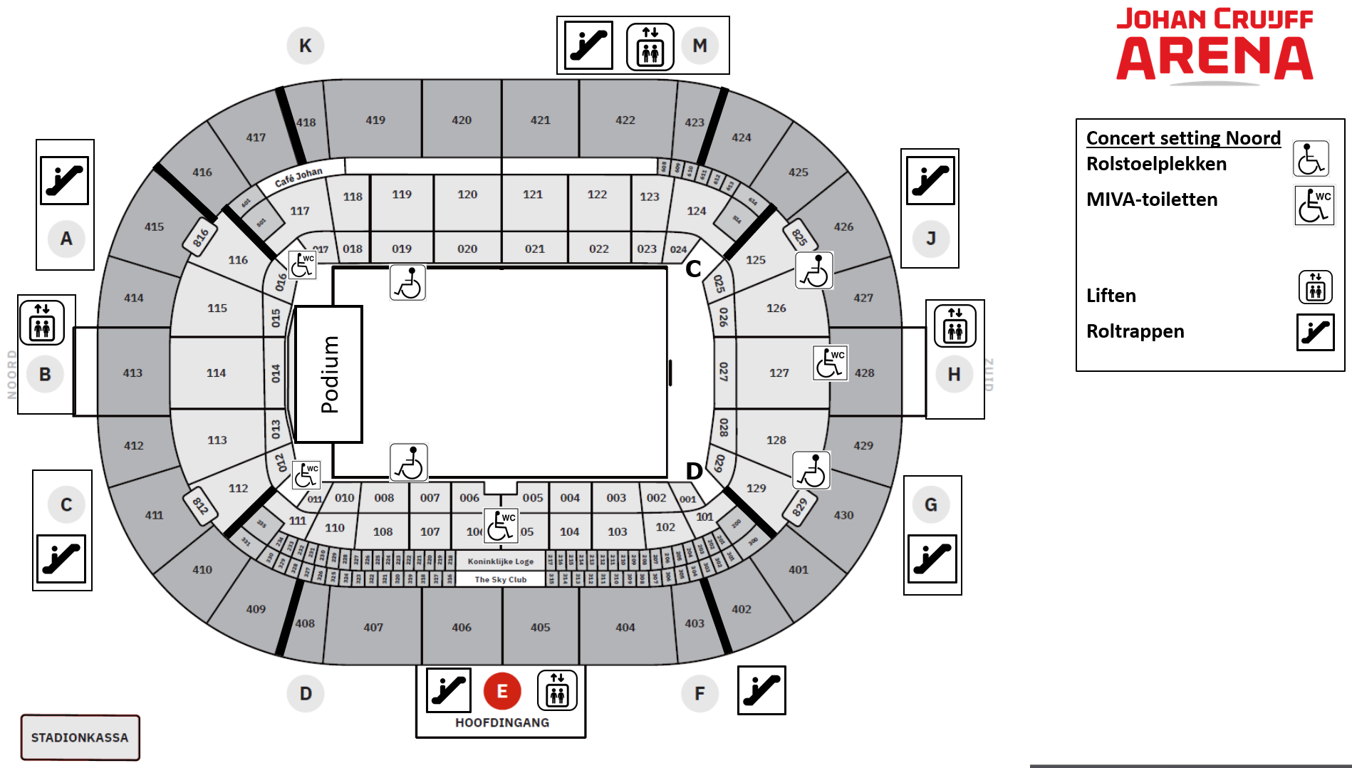 Om je makkelijk door het stadion te bewegen, kun je gebruikmaken van verschillende roltrappen. Afhankelijk van jouw ingang gaan deze tot de eerste of tweede ring. De roltrappen bevinden zich bij de verschillende ingangen: hoofdingang E en ingangen A, C, G, J en M.